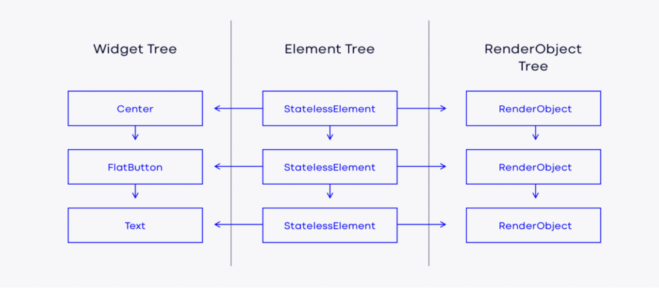 우리가 작성한 flutter 코드는 어떤 과정을 거쳐서 화면에 표시되는걸까? 엉성하게 보고 대충 이렇군..넘어가다가 제대로 알아보고자 마음먹고 작성합니다.. 플러터는 부드러운 UI를 위해 1초에 60프레임을 목표로 합니다. 그 뜻은 1초에 최소 60번 화면을 다시 그린다는 의미입니다. 플러터는 이런 빠른 렌더링 성능을 보장하기 위해 build 단계에서 widgetTree와 elementTree를 만들어 사용하고, layout 단계에서 RenderObjectTree를 생성합니다. 아래에 자세히 설명하겠습니다. 위와 같이 총 3개의 트리를 사용하는 이유는 한번 화면을 그린 후에는 전체를 다시 재렌더링 하는게 아닌 꼭 필요한 부분만 다시 그리기 위해서라고 합니다. 플러터의 모든 것은 위젯으로 이루어진다 라는 ..