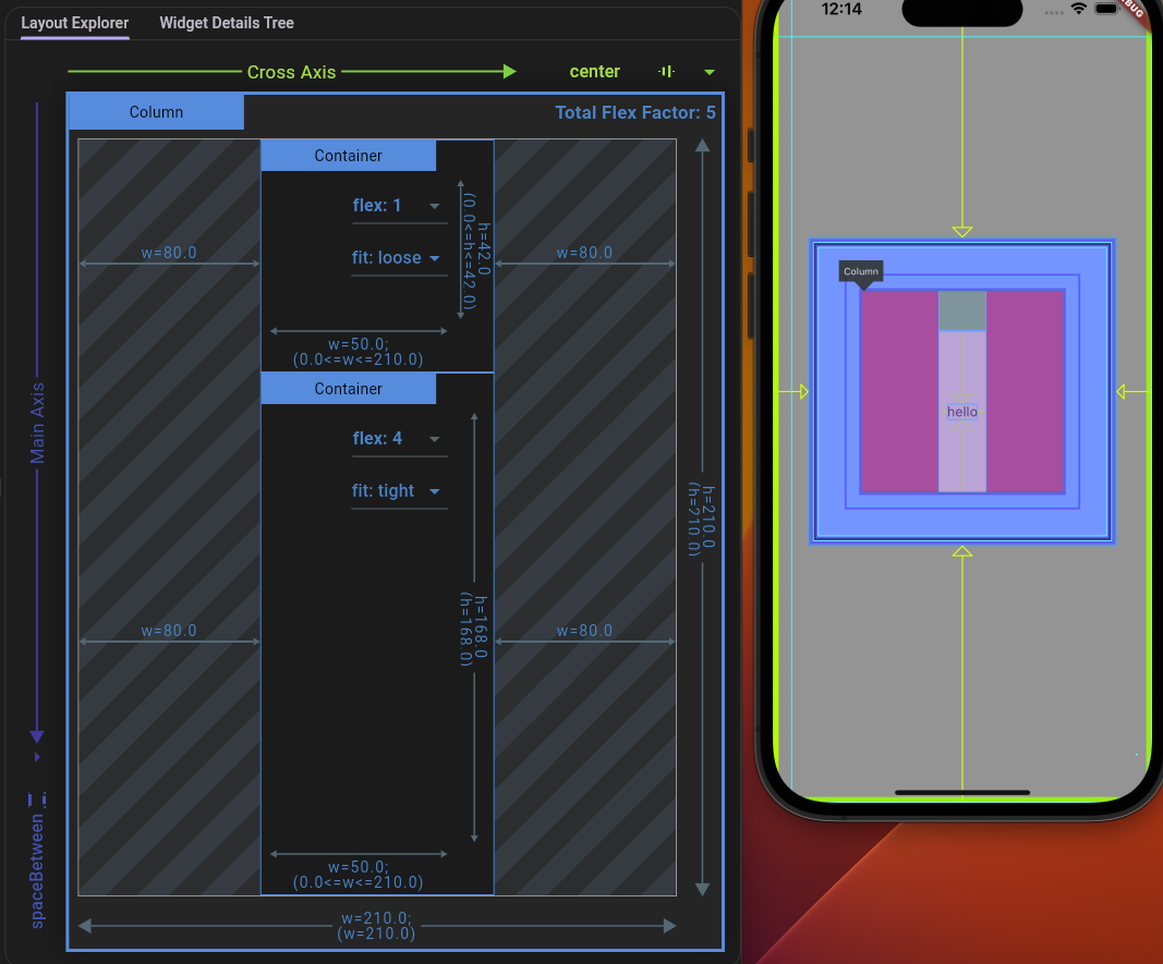 이 뿐만 아니라, Row나 Column과 같은 Flex 위젯의 경우에는, 코드를 수정하지 않고도 설정 값을 바꿔보며 레이아웃이 어떻게 적용되는 지 확인해 볼 수도 있다. 위 이미지에서와 같이, Flex 위젯을 선택하면 다양한 드롭다운 버튼이 활성화 되는데, 이를 통해 조작해볼 수 있다. minAxisAlignment, crossAxisAlignment 값을 바꿔가며 테스트 해 볼 수 있고, 자식 위젯들 각각의 flex와 fit을 조절해 가며 레이아웃 변화를 확인할 수 있다.