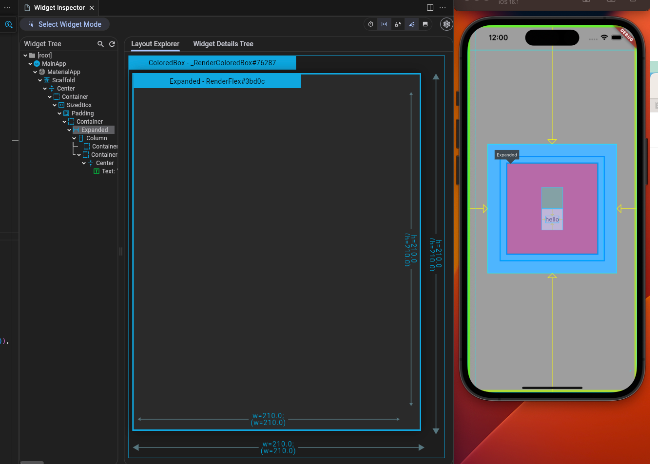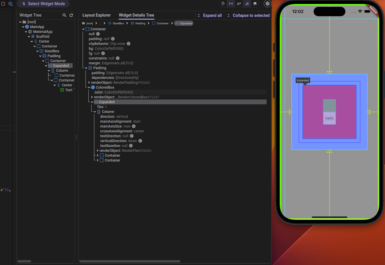 내가 배치한 위젯이 어느 정도의 영역을 차지하는 지, 특히나, Flex 위젯(Row, Column 등) 내에서 어떤 설정 덕에 이런 요상한 레이아웃을 만들어 낸 것인지 알고 싶을 때가 있다. 그런데 대부분의 경우 위젯의 레이아웃을 코드만 보고 파악하는 것은 굉장히 번거롭고 귀찮다. 그 때는 Widget Inspector를 이용하면 된다. Widget Inspector는 vscode의 '명령 팔레트'에서 'Flutter: Inspect Widget'을 통해 실행하거나, 앱 실행 후 중지 버튼 옆의 파란색 돋보기 모양의 버튼을 눌러서 실행할 수 있다. 왼쪽 상단의 'Select Widget Mode'를 활성화 하고 정보를 보고자 하는 위젯을 탭하면 해당 위젯의 레이아웃과 세부 정보를 볼 수 있다. 'Widget Tree'에서 원하는 위젯을 찾아서 볼 수도 있다.