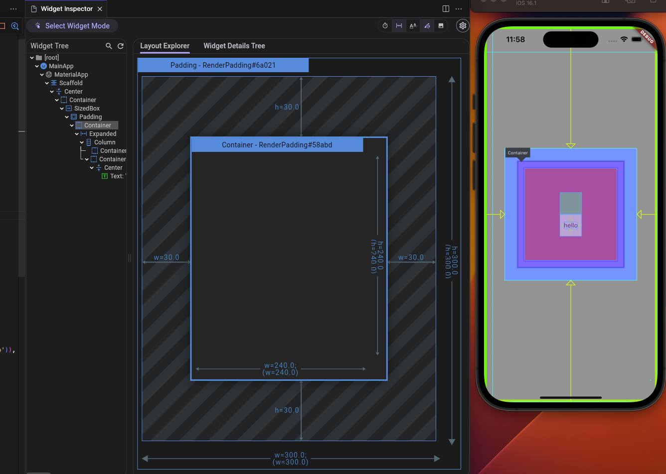 위의 이미지를 보면 알겠지만, 레이아웃을 한 눈에 빠르게 파악할 수 있다. 선택한 Container 위젯은 상하좌우 30만큼의 padding을 가진, Padding 위젯에 둘러싸여 있다.