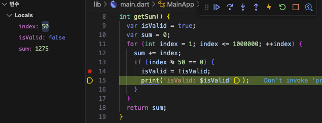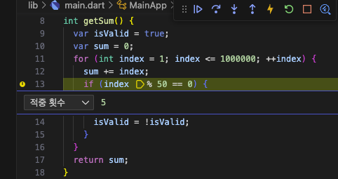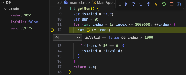각 중단점에는 중단 조건을 명시하여, 해당 조건이 만족할 때만 그 중단점에 의해 프로세스가 중단될 수 있도록 할 수 있다. 위 이미지는 isValid 값이 false로 변경되었을 때만 중단되도록 설정한 것이며, 그에 따라 index 값이 51이 되었을 때 최초로 디버거가 프로세스를 중단한 것을 볼 수 있다.