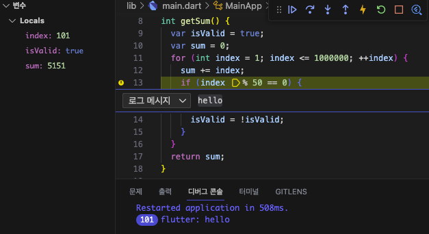 여기에 더해, 중단점이 지정된 지점이 실행될 때마다 콘솔에 로그를 남길 수도 있다. (조건과 무관한 듯 하다...)