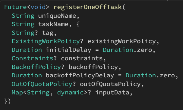 taskName은 Workmanager().excuteTask의 Future<bool> Function(String, Map<String, dynamic>?) 형식을 가지는 parameter에서 String에 해당하는 부분이다. 다시 말해, (task, inputData) 중 task에 해당하는 부분이다.