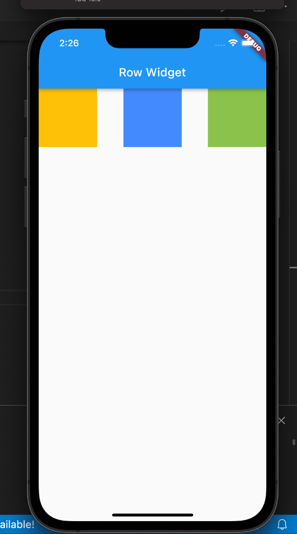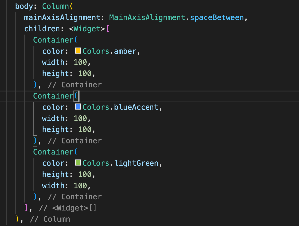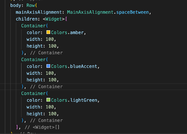 Row는 X축을 기준으로 정렬하며 MainAxisAlignment라는 인자를 사용하여 정렬합니다.