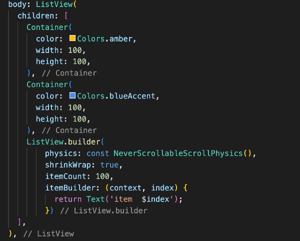 여기서 스크롤이 SingleChildScrollView에도 들어가고 ListView.builder에도 들어가게 되어 따로따로 스크롤을 할 수 있는데 그렇게 동작하지 않게 하고 싶다면 ListView.builder의 인자인
