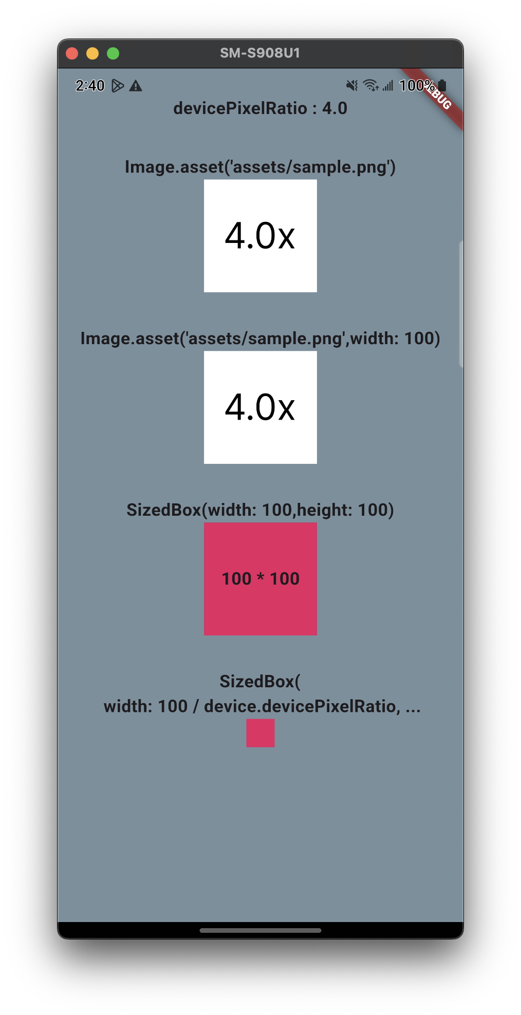 s22 ultra는 해상도가 높기 때문에 플러터에서 devicePixelRatio를 4.0으로 표시하고 있다.